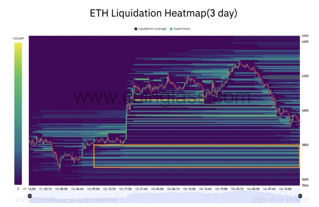 Heatmap likuidasi dari CoinGlass menunjukkan adanya beberapa zona minat beli di bawah harga pasar saat ini, dengan pesanan beli senilai lebih dari $743 juta berada di rentang harga $3.670 hingga $3.800. Hal ini mengindikasikan bahwa koreksi yang sedang berlangsung mungkin akan tertahan di kisaran harga tersebut.