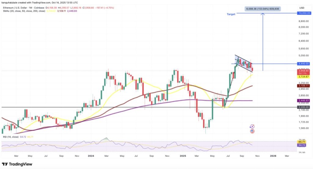 Jakarta, Pintu News – Ethereum mengalami penurunan pada hari Selasa (14/10), turun lebih dari 8% dari level tertinggi hari Senin yang berada di atas $4.300 menjadi sekitar $3.940. Meskipun terjadi koreksi ini, para trader tetap optimis bahwa harga ETH akan kembali naik selama level support kunci tetap bertahan.