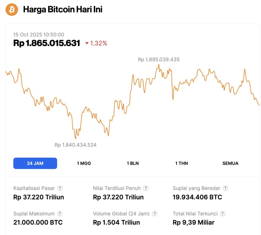 Pada 15 Oktober 2025, harga Bitcoin tercatat berada di level $112,111 atau setara dengan Rp1.865.015.631, mengalami penurunan 1,32% dalam 24 jam terakhir. Sepanjang periode ini, BTC menyentuh level terendahnya di Rp1.840.434.524 dan harga tertingginya di Rp1.895.039.435.