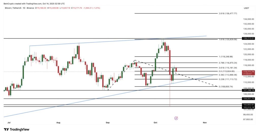 Pada grafik harian (14/10), Bitcoin masih bergerak dalam pola rising wedge — sebuah formasi yang sering kali menandakan kebimbangan atau kelelahan pasar setelah reli kuat. Usai crash, BTC menemukan support di sekitar $111.100 (level Fibonacci 0,236), di mana para pembeli terus mempertahankan zona ini.