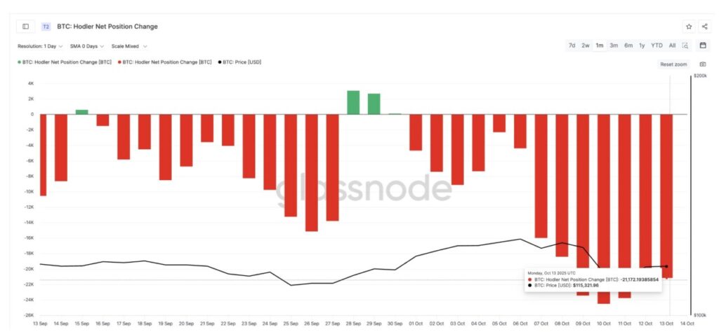 Metrik Holder Net Position Change, yang memantau seberapa banyak Bitcoin yang dibeli atau dijual oleh investor jangka panjang, juga menunjukkan perbaikan. Setelah crash, metrik ini mulai menjadi kurang negatif, naik dari –24.506 BTC pada 10 Oktober menjadi –21.172 BTC pada 13 Oktober (peningkatan 14%). Ini menandakan bahwa investor jangka panjang mulai kembali melakukan akumulasi secara bertahap.