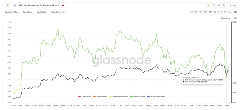 Salah satu metrik penting, Net Unrealized Profit/Loss (NUPL) — yang mengukur apakah investor sedang mencatat keuntungan atau kerugian di atas kertas — turun ke level 0,50 pada 11 Oktober, terendah sejak April. Ini menunjukkan bahwa sebagian besar trader telah “menyerap” kerugiannya, yang sering kali menjadi tanda bahwa fase penjualan mulai mereda.