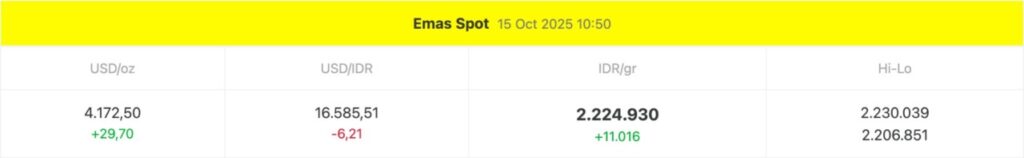 Dengan nilai tukar USD/IDR sebesar Rp16.585,51, harga emas Antam 1 gram pun melonjak ke posisi Rp2.224.930 atau naik Rp11.016 dari hari sebelumnya. Grafik harian dan tren bulanan menunjukkan bahwa tren kenaikan ini telah berlangsung sejak awal Oktober.