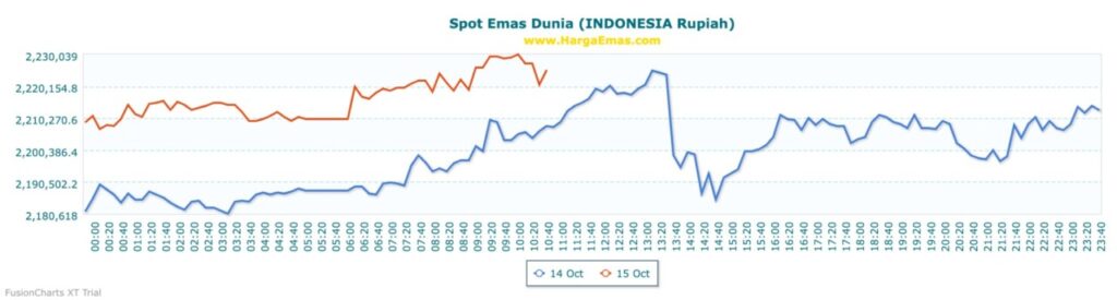 Grafik harian harga emas spot (IDR/gram) menunjukkan tren menguat konsisten sejak pukul 07.00 WIB dengan titik tertinggi menyentuh Rp2.230.039 dan terendah di Rp2.206.851. Sementara grafik bulanan emas Antam mencatat bahwa sejak 1 Oktober 2025 di harga Rp2.237.000, harga telah naik bertahap ke Rp2.383.000 per 15 Oktober, artinya ada kenaikan sekitar Rp146.000 atau 6,52% dalam dua minggu terakhir.
