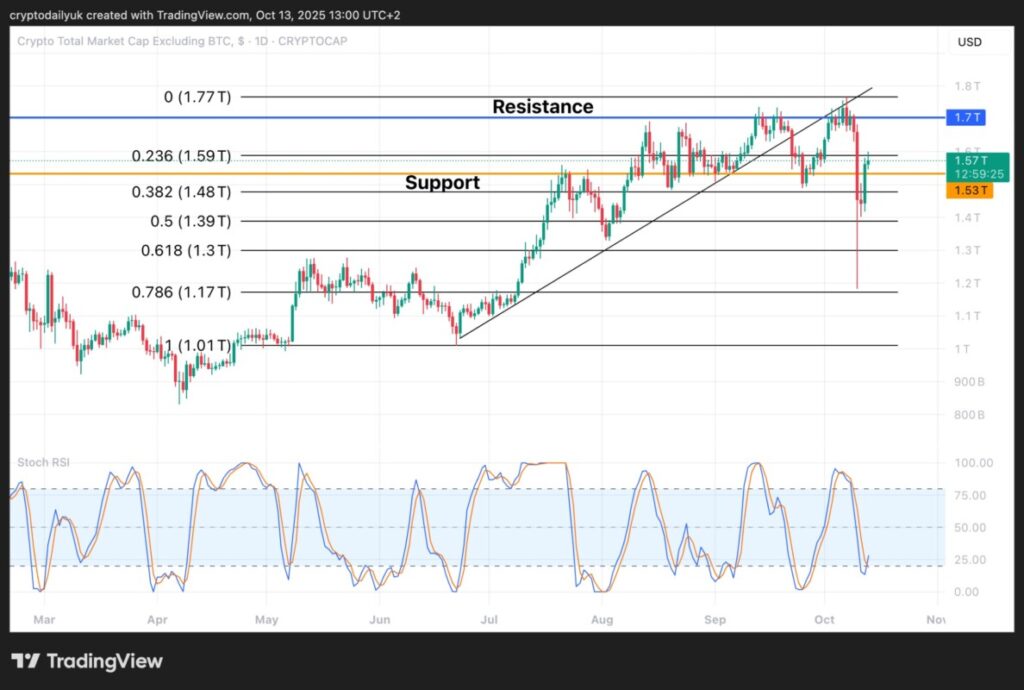 Meskipun terjadi penurunan tajam, pemulihan harga di pasar kripto dimulai hampir seketika. Total2 berhasil pulih ke $1,44 triliun sebelum akhirnya naik lagi pada hari Minggu. Indikator Stochastic RSI menunjukkan momentum harga yang meningkat, dan jika tren ini berlanjut, kapitalisasi pasar Total2 bisa mencapai rekor tertinggi baru.