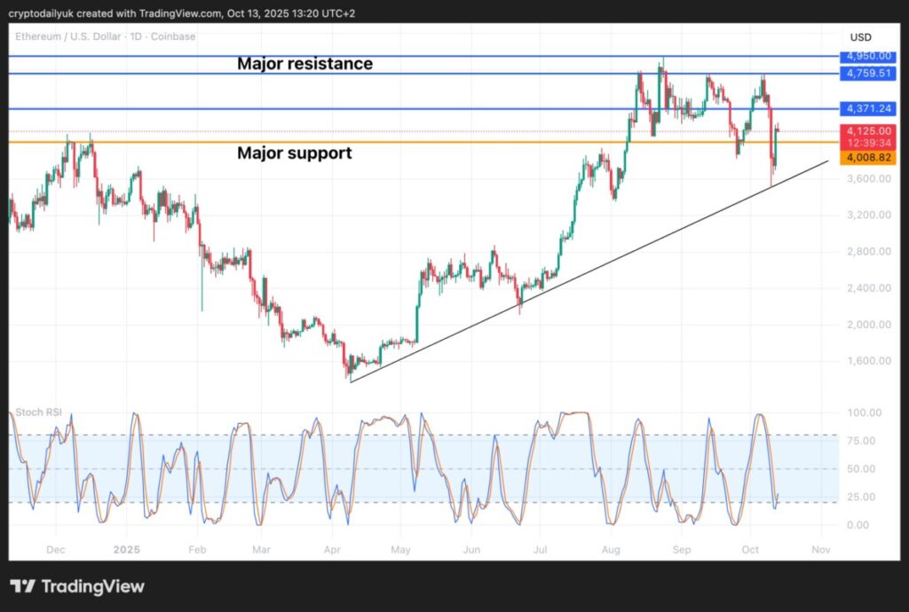 Ethereum (ETH), salah satu kripto dengan kapitalisasi pasar terbesar, sempat kehilangan dukungan penting di level $4.000 dan turun di bawah $3.600. Namun, sebuah garis tren berhasil menahan penurunan lebih lanjut dan harga ETH memantul kembali.