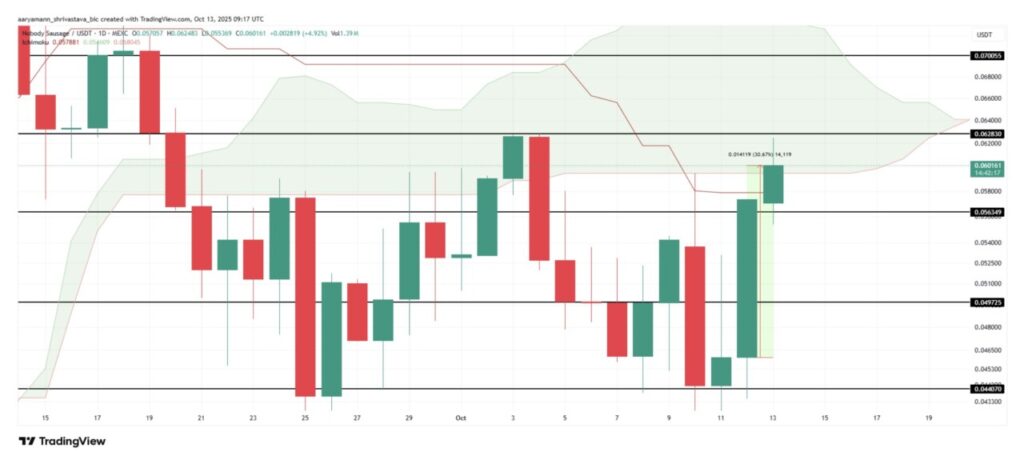 Harga NOBODY melonjak 30,6% dan sempat diperdagangkan di angka $0,0601 pada 13 Oktober 2025. Altcoin ini berada tepat di bawah level resistance penting di $0,0628, yang bisa ditembus jika momentum bullish terus menguat.