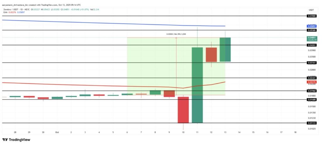 Zerebro menjadi meme coin yang paling menonjol minggu ini, melonjak sebesar 166% dan menarik perhatian para investor di seluruh pasar. Per 13 Oktober, altcoin tersebut diperdagangkan di harga $0,0485, mencerminkan sentimen bullish yang kuat meskipun pasar secara keseluruhan sedang bergejolak.