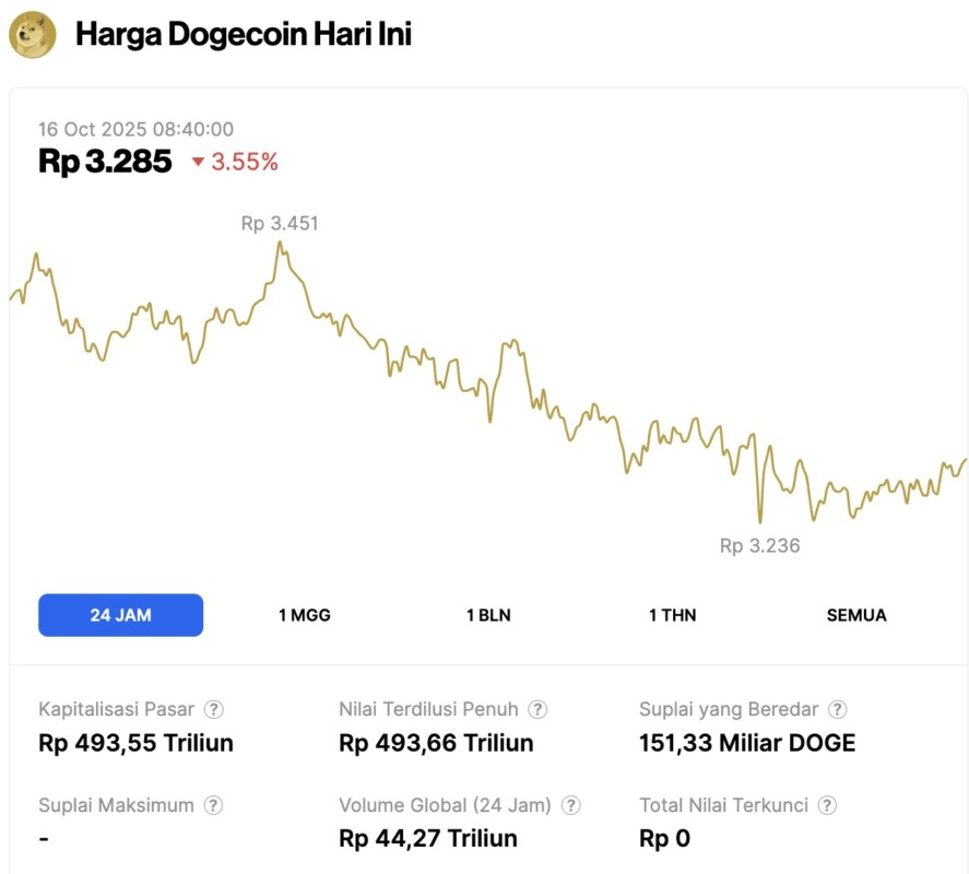 Pada 16 Oktober 2025, harga Dogecoin tercatat mengalami penurunan 3,55% dalam waktu 24 jam, diperdagangkan pada harga $0.1973 atau setara dengan Rp3.285. Dalam periode 24 jam terakhir, harga DOGE bergerak dalam kisaran Rp3.451 hingga Rp3.236.