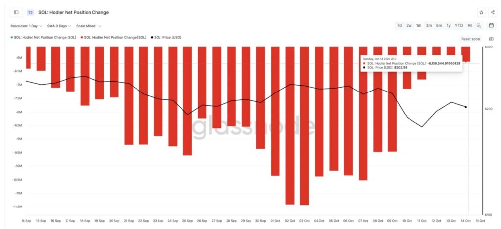 Holder Net Position Change — indikator yang mengukur seberapa banyak pemegang jangka panjang membeli atau menjual — memang masih berada di wilayah negatif, tetapi menunjukkan perbaikan yang signifikan. Antara tanggal 3 hingga 14 Oktober, pemegang jangka panjang mengurangi aksi jual bersih mereka dari sekitar 11,4 juta SOL menjadi 6,1 juta SOL, atau turun sekitar 46%.