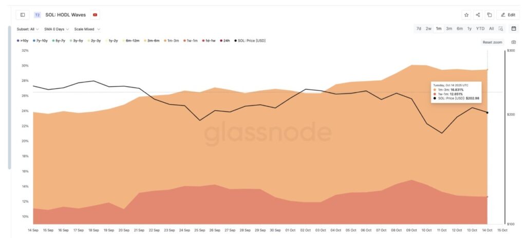 Di sisi lain, pemegang jangka pendek menunjukkan pola akumulasi yang jelas, berdasarkan data dari indikator HODL Waves. Kelompok yang memegang aset selama 1 minggu hingga 1 bulan meningkatkan kepemilikannya dari 11,1% pada 14 September menjadi 12,65% pada 14 Oktober, meskipun sempat menjual sedikit saat penurunan.