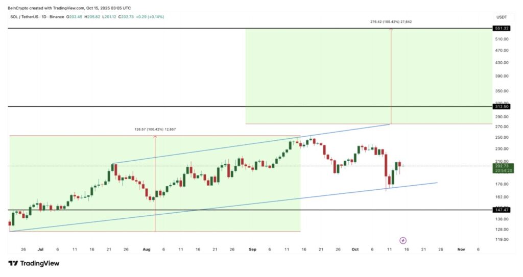Dari sisi analisis teknikal, Solana telah bergerak dalam pola channel naik (ascending channel) yang lebar sejak 22 Juni. Setiap pergerakan besar yang terjadi sejauh ini mengikuti struktur channel tersebut, di mana pergerakan antara Juni hingga September menghasilkan kenaikan sebesar 100%.