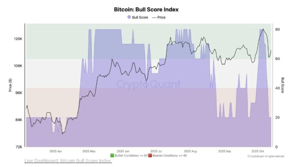 Indeks Bull Score dari CryptoQuant tidak hanya mengalami penurunan, tetapi benar-benar anjlok. Dari posisi kuat di angka 80 minggu lalu, kini turun drastis ke angka 20. Secara historis, skor di bawah 40 sering kali berkorelasi dengan fase pasar yang bearish.