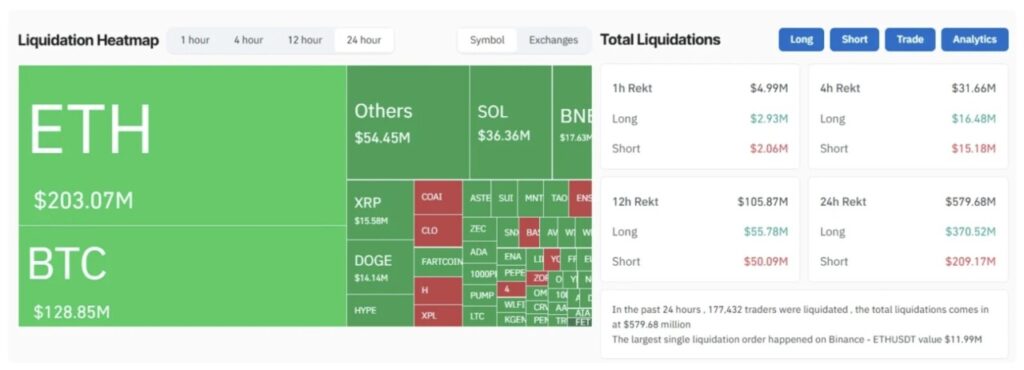 Selain itu, peta likuidasi menunjukkan bahwa hampir $580 juta posisi perdagangan telah dilikuidasi dalam 24 jam terakhir, dengan ETH dan BTC menjadi yang paling terdampak — masing-masing sebesar $203 juta dan $129 juta.