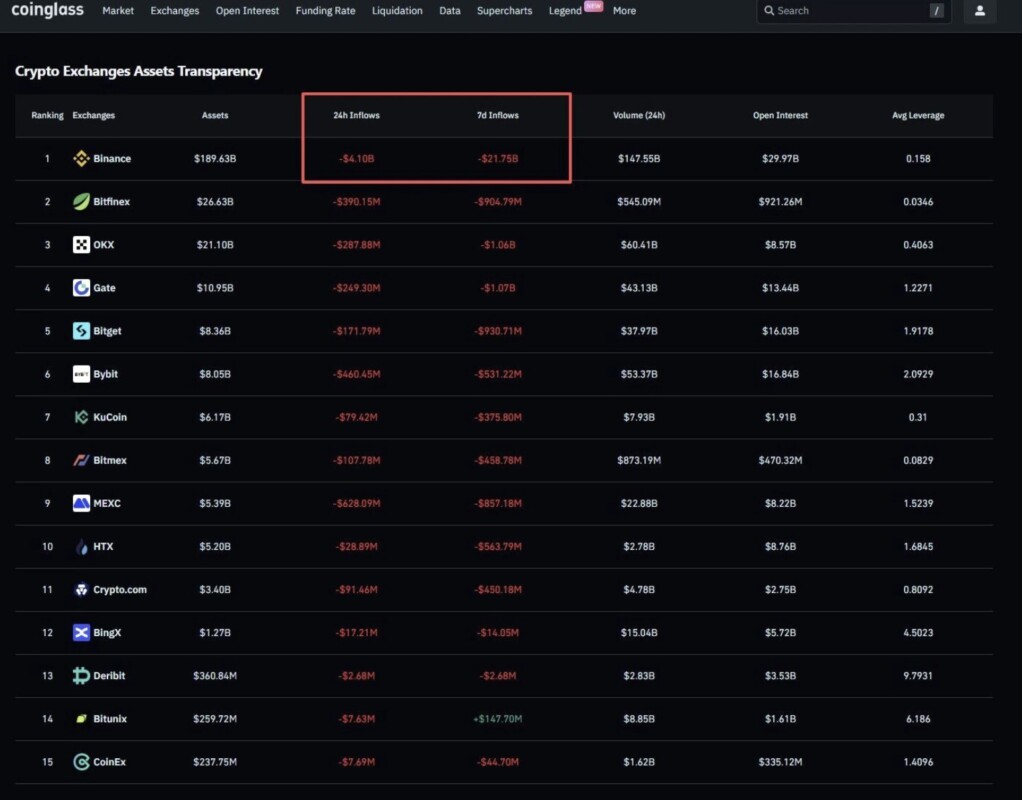Menurut data dari CoinGlass, bursa kripto terpusat mencatat outflow besar-besaran — sebuah indikasi klasik dari ketidakpastian dan hilangnya kepercayaan pasar.