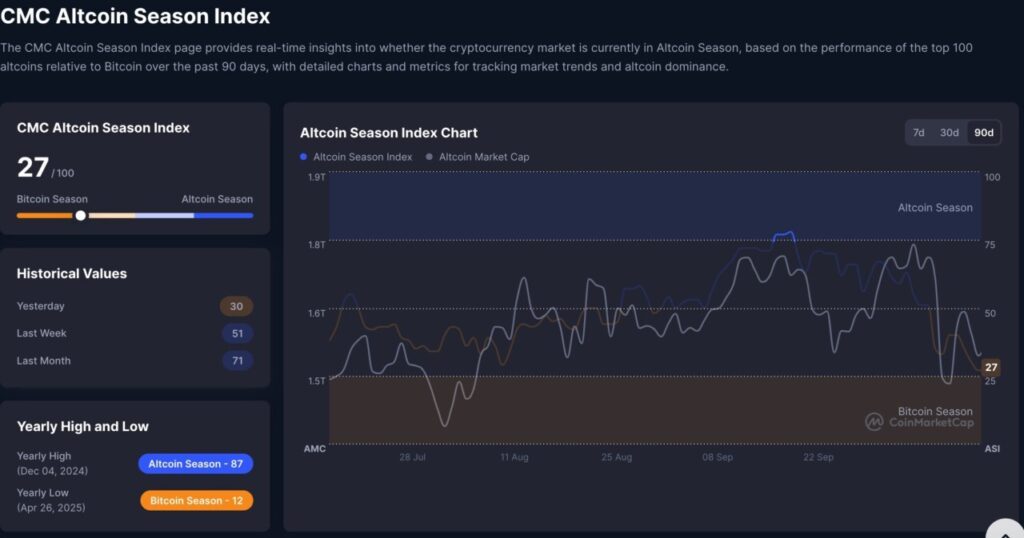 Berdasarkan data Altcoin Season Index CoinMarketCap per 16 Oktober 2025: