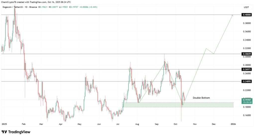Mengutip laporan Coingape (16/10), harga Dogecoin telah membentuk pola double bottom yang kuat di sekitar zona support $0,18, menandakan potensi pembalikan tren bullish setelah penurunan sebelumnya.