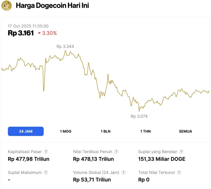 Pada 17 Oktober 2025, harga Dogecoin tercatat mengalami penurunan 3,30% dalam waktu 24 jam, diperdagangkan pada harga $0.1901 atau setara dengan Rp3.161. Dalam periode 24 jam terakhir, harga DOGE bergerak dalam kisaran Rp3.344 hingga Rp3.074.