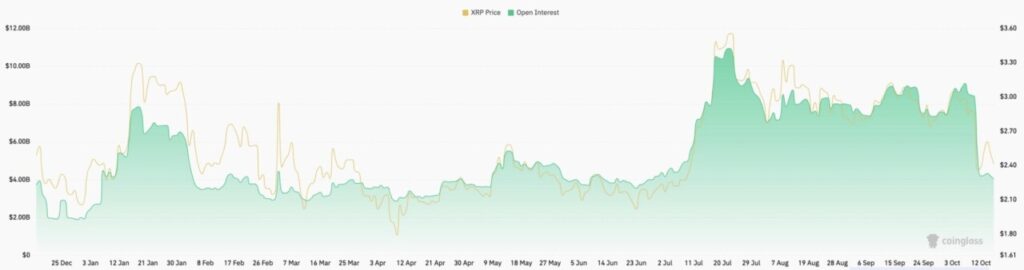 Akibatnya, mulai terlihat tanda-tanda bahwa permintaan terhadap XRP mulai melemah. Salah satu indikatornya adalah open interest (OI) yang turun drastis ke $4.05 miliar, dari sebelumnya $9 miliar sebelum kejatuhan pasar kripto baru-baru ini. Penurunan OI umumnya menunjukkan menurunnya minat atau permintaan terhadap suatu aset.