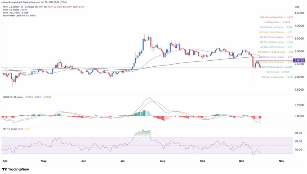 Grafik harian menunjukkan bahwa XRP mengalami hari terburuknya pada hari Jumat lalu, di mana harganya anjlok hingga 37%. XRP sempat jatuh ke titik terendah di $1.77, turun sekitar 52% dari level tertingginya tahun ini. Setelah itu, harga sempat bangkit dan menyentuh level resistensi di $2.6425.