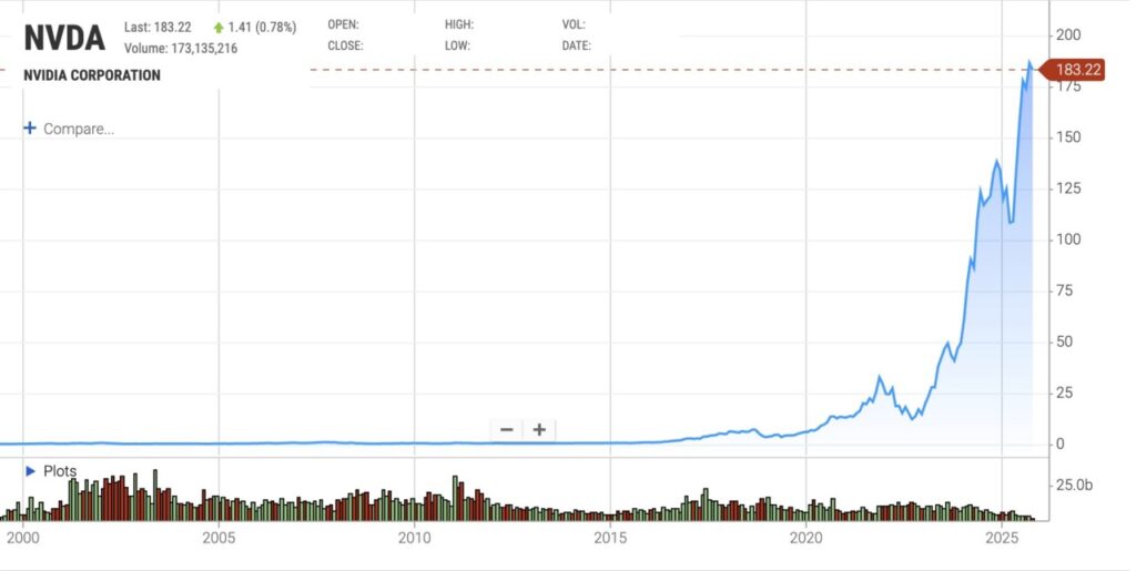 Grafik harga saham Nvidia Corporation menunjukkan perjalanan yang luar biasa dari tahun 2000 hingga 2025. Dalam lebih dari dua dekade, Nvidia telah bertransformasi dari perusahaan chip grafis biasa menjadi raksasa semikonduktor global yang mendominasi industri GPU dan kecerdasan buatan (Artificial Intelligence).