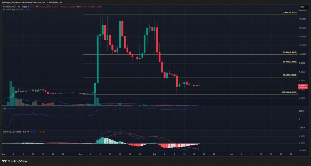 Pada bulan September, volume perdagangan MYX meningkat secara signifikan, namun mengalami penurunan ketika harga turun di bawah $10. Hal ini menyebabkan MYX kehilangan hampir seluruh keuntungan yang telah diperoleh. Pada titik tertentu, level retracement Fibonacci 78,6% di $4,82 sempat bertindak sebagai dukungan, namun tidak cukup kuat untuk mencegah penurunan lebih lanjut.