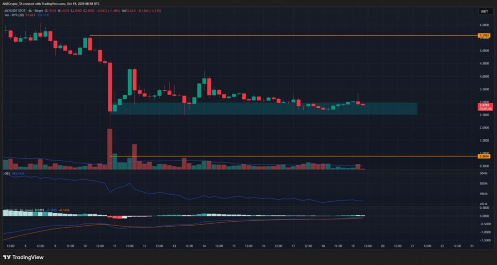 Volatilitas terbaru sebagian besar dipicu oleh penjualan altcoin pada hari Jumat lalu. Jika MYX dapat mempertahankan dukungan di zona $2,5 dan melampaui tinggi ayunan di $5,6, ini bisa menjadi indikasi bahwa pembeli mulai mengendalikan pasar. Selain itu, peningkatan pada Moving Average Convergence Divergence (MACD) menuju garis nol bisa menjadi petunjuk awal bahwa momentum mulai berubah.