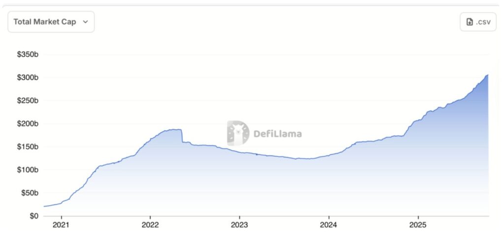 Total pasokan stablecoin telah melonjak ke rekor tertinggi sepanjang masa, yakni sebesar $304,5 miliar, menandakan terjadinya akumulasi likuiditas besar-besaran dalam ekosistem kripto.