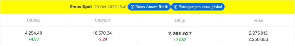Jakarta, Pintu News – Harga emas Antam per Senin, 20 Oktober 2025, menunjukkan tren kenaikan seiring dengan menguatnya harga emas dunia dan dinamika kurs Rupiah terhadap Dolar AS. Berdasarkan data dari HargaEmas.com harga emas Antam 1 gram hari ini berada di kisaran Rp2.266.527, naik sekitar Rp2.082 dibandingkan hari sebelumnya.