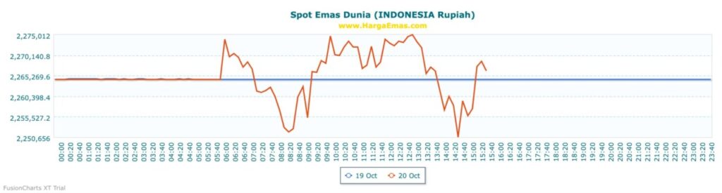 Berdasarkan grafik harian spot emas dunia (dalam Rupiah), pergerakan harga mengalami fluktuasi tajam antara pukul 06:00 hingga 10:00 WIB, mencapai titik terendah di Rp2.250.656 dan tertinggi di Rp2.275.012 per gram. Namun, secara umum, tren kembali stabil menjelang sore hari, menunjukkan pemulihan permintaan.