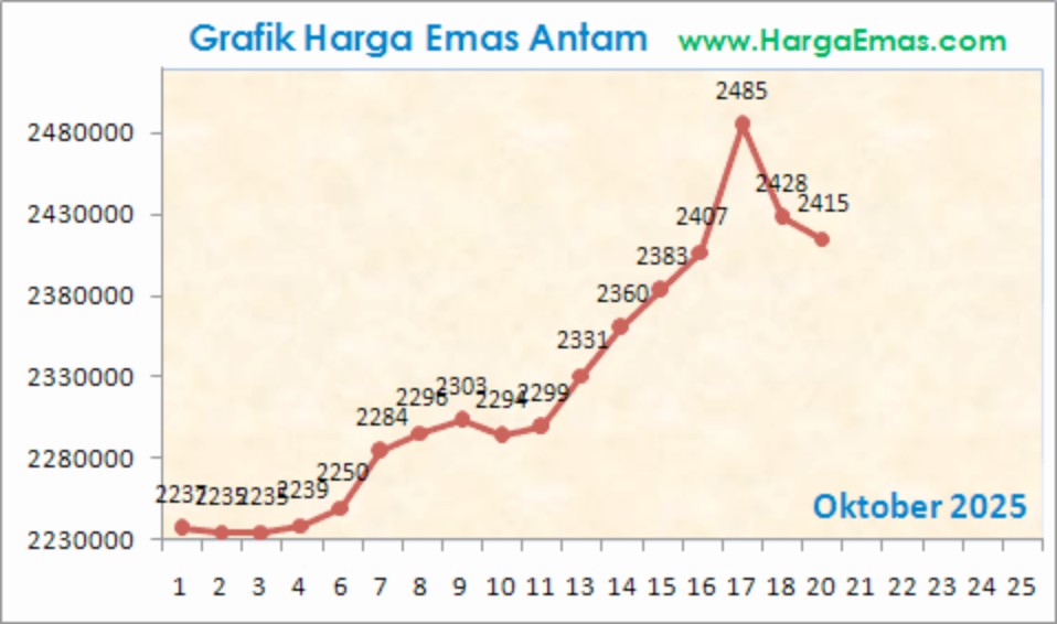 Melihat tren bulanan di Oktober 2025, harga emas Antam sempat menembus rekor tertinggi Rp2.485.000 per gram pada 16 Oktober, sebelum turun ke Rp2.428.000, dan hari ini ke Rp2.415.000. Meskipun terjadi sedikit koreksi dari level puncak, tren secara keseluruhan masih berada dalam fase bullish, mencerminkan keyakinan pasar terhadap aset logam mulia.