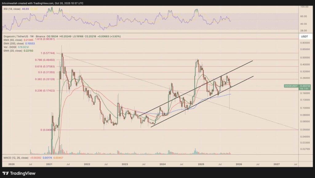 Per 20 Oktober, DOGE diperdagangkan di kisaran $0,20, berada nyaman di atas rata-rata pergerakan eksponensial 200-minggu (200-week EMA; garis biru) di $0,156, dan tengah menguji EMA 20-minggu (garis hijau) dan EMA 50-minggu (garis merah) sebagai level resistensi jangka pendek.