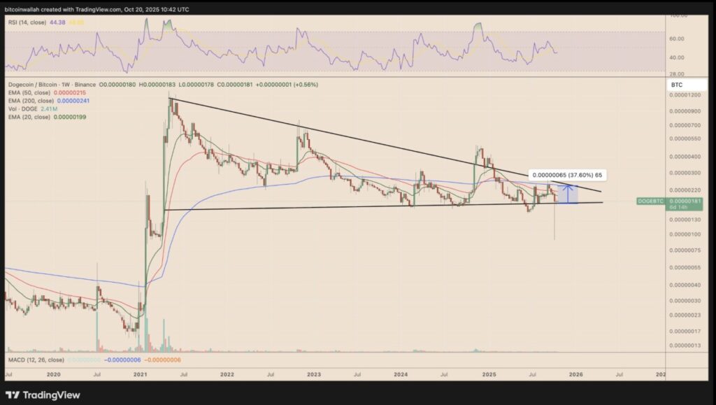 Pasangan DOGE/BTC juga mendukung sentimen bullish ini, dengan harga yang terus bergerak dalam pola segitiga menurun (descending triangle) jangka panjang, sambil memantul dari level support horizontal di sekitar 0.0000017 BTC.