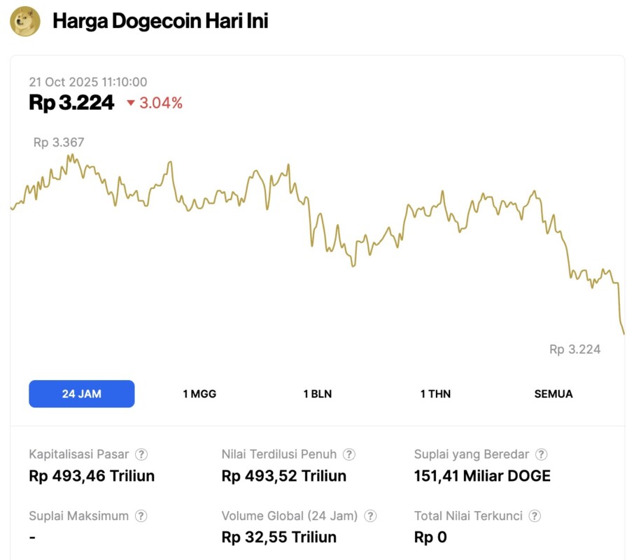 Pada 21 Oktober 2025, harga Dogecoin tercatat mengalami penurunan 3,04% dalam waktu 24 jam, diperdagangkan pada harga $0.1944 atau setara dengan Rp3.224. Dalam periode 24 jam terakhir, harga DOGE bergerak dalam kisaran Rp3.367 hingga Rp3.224.