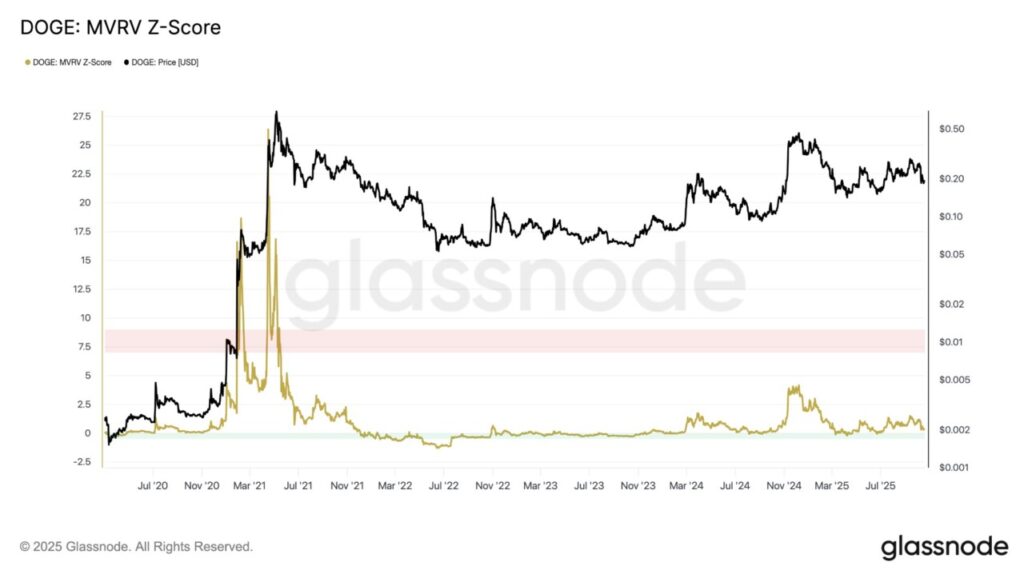 Grafik MVRV Z-Score untuk Dogecoin menunjukkan bahwa aset ini masih tergolong undervalued jika dibandingkan dengan siklus historisnya, memperkuat kemungkinan terjadinya reli lanjutan.