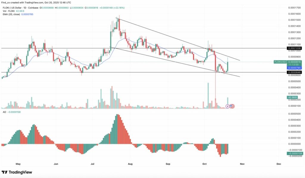 Pada awal perdagangan 20 Oktober 2025, harga FLOKI berada di angka $0.000065 — mencerminkan penurunan sebesar 43% dalam tiga bulan terakhir. Namun, situasi berubah drastis hanya dalam beberapa menit setelah Elon Musk membuat unggahan tentang anjingnya, yang kebetulan memiliki nama yang sama dengan memecoin tersebut.