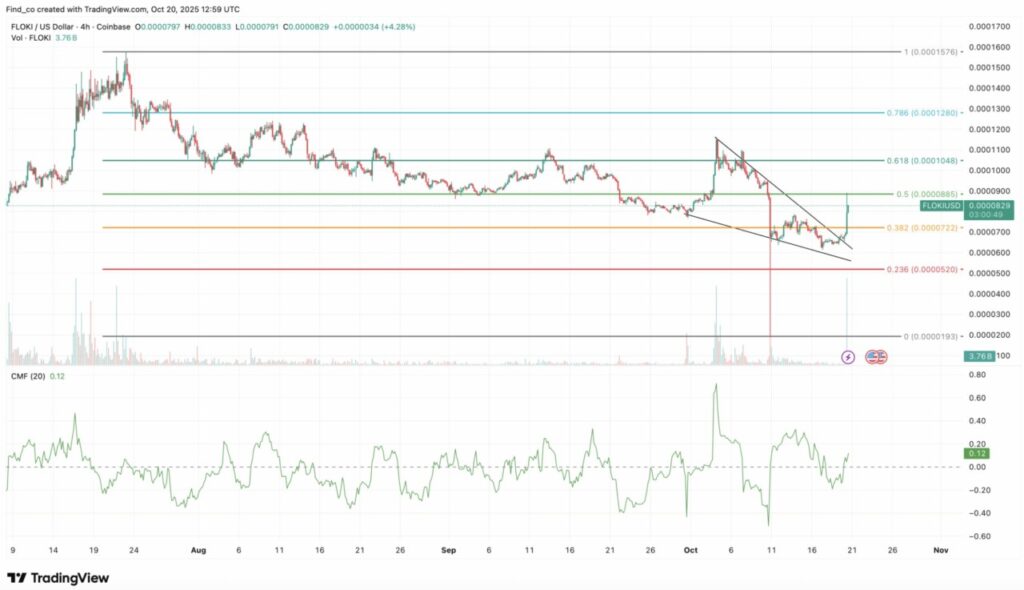 Pada grafik 4 jam (20/10), FLOKI telah berhasil menembus garis resistance kunci, menandakan kembalinya momentum bullish. Di saat yang sama, indikator Chaikin Money Flow (CMF) telah naik melewati garis nol, yang menunjukkan peningkatan tekanan beli dan aliran modal yang masuk ke pasar.