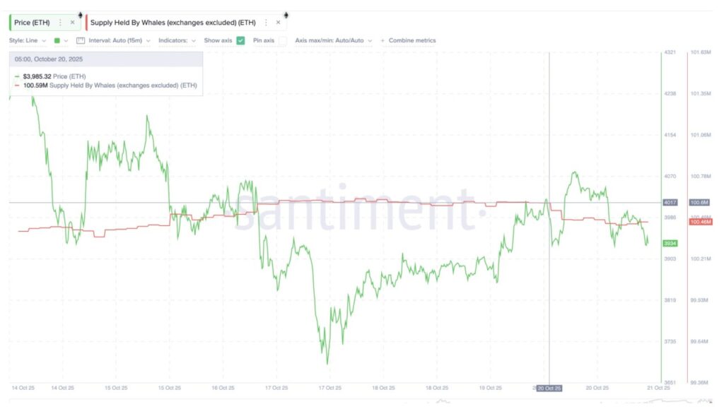 Tanda tekanan pertama datang dari para pemegang Ethereum terbesar — whales. Sejak 20 Oktober, alamat-alamat whale telah mengurangi kepemilikan mereka dari 100,60 juta ETH menjadi 100,46 juta ETH.