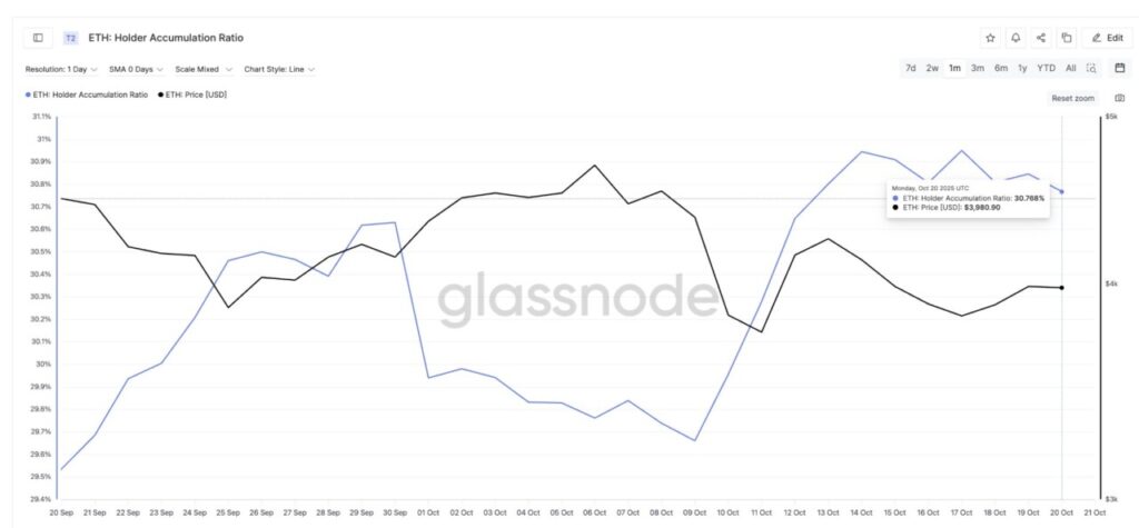 Di saat yang sama, indikator Holder Accumulation Ratio (HAR) Ethereum — yang mengukur persentase pemegang aktif yang menambah posisi dibandingkan yang mengurangi — juga stagnan di kisaran 30,77%. Sebelumnya, angka ini sempat meningkat di awal Oktober, namun mulai datar sejak pertengahan bulan, menandakan bahwa akumulasi baru mulai melambat.