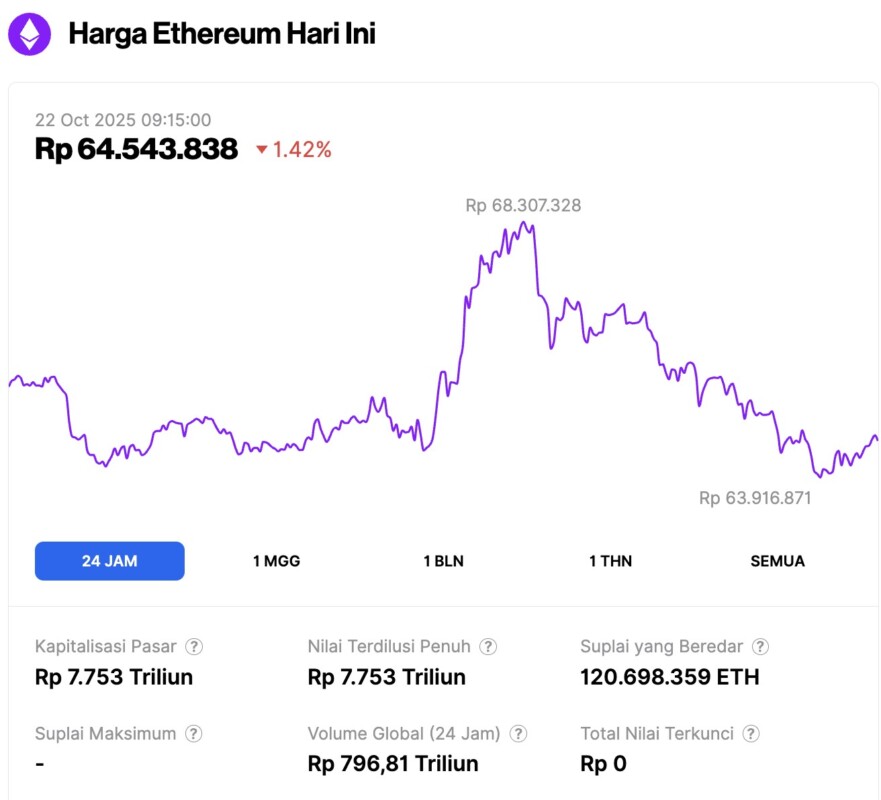 Pada 22 Oktober 2025, harga Ethereum tercatat berada di sekitar $3,873 atau setara dengan Rp64.543.838, mengalami koreksi 1,42% dalam 24 jam terakhir. Sepanjang periode ini, ETH sempat menyentuh level terendahnya di Rp63.916.871, dan level tertingginya di Rp68.307.328.