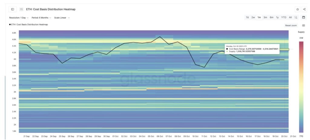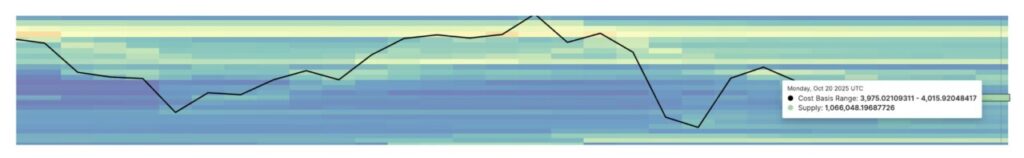 Saat ini, terdapat zona resistensi padat antara $3.955 hingga $4.015, di mana sekitar 1,06 juta ETH dibeli di rentang ini. Artinya, setiap kali harga ETH mendekati $4.000, tekanan jual meningkat karena banyak pemegang sebelumnya ingin keluar di titik impas atau dengan sedikit keuntungan.