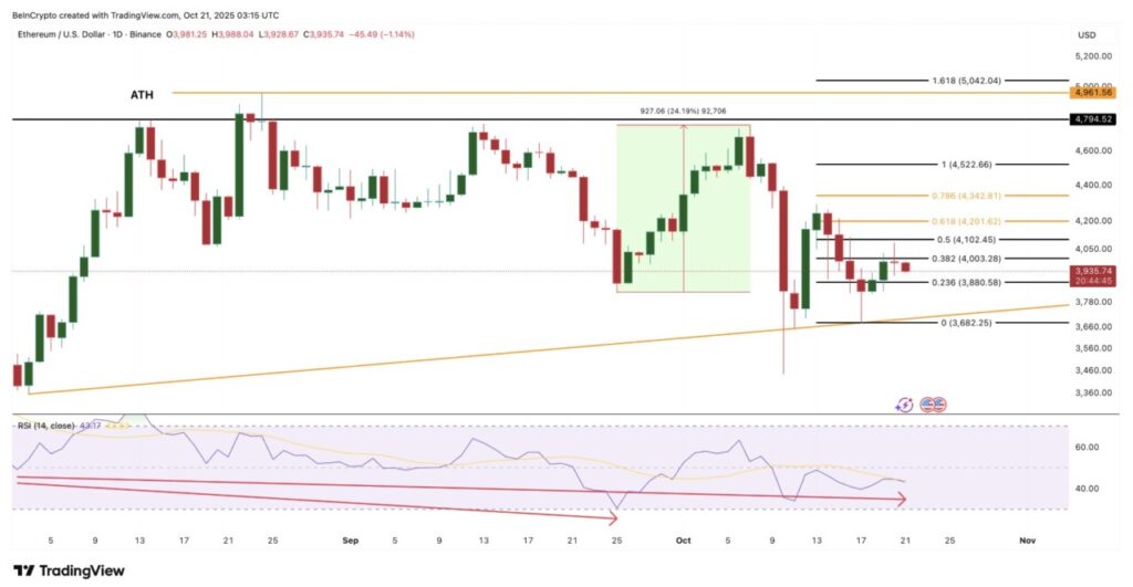 Jakarta, Pintu News – Sepanjang bulan Oktober, harga Ethereum terus berjuang untuk membangun kekuatan di atas level $4.000. Meskipun secara umum masih berada dalam tren naik, ETH saat ini diperdagangkan di sekitar $3.800, turun 6,3% dalam sepekan terakhir — menunjukkan keraguan saat Bitcoin mulai pulih.