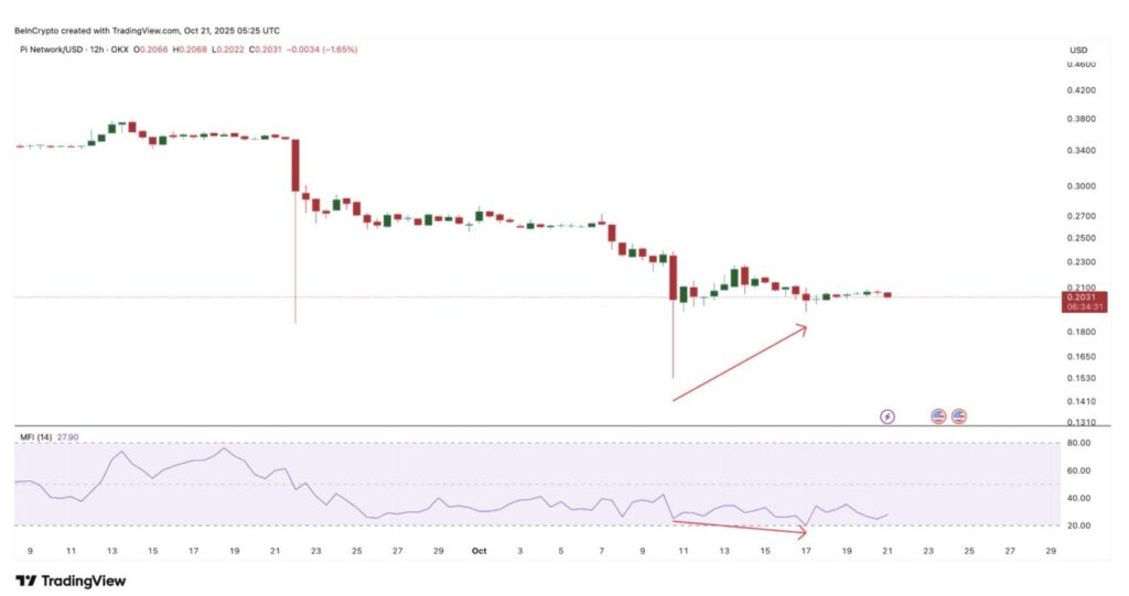 Pertama, Money Flow Index (MFI) — indikator yang mengukur arus masuk dan keluar uang dari suatu aset — menunjukkan adanya divergensi bearish. Antara 10 hingga 17 Oktober, harga Pi Coin sempat membentuk higher low, tetapi MFI justru mencatatkan lower low.