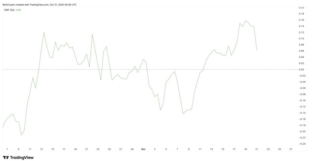 Kedua, Chaikin Money Flow (CMF) — yang mencerminkan arus uang besar dari investor institusi — masih berada sedikit di atas garis nol (positif), namun mengalami penurunan tajam sejak 20 Oktober. Penurunan CMF saat masih positif biasanya menandakan bahwa meskipun investor besar belum sepenuhnya keluar, mereka mulai mengurangi pembelian baru.