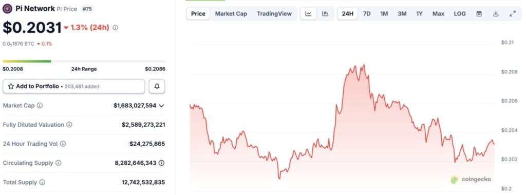 Sepanjang hari, harga PI bergerak dalam rentang sempit antara $0,2008 hingga $0,2086, mencerminkan volatilitas yang relatif rendah namun tetap berada dalam tren penurunan.