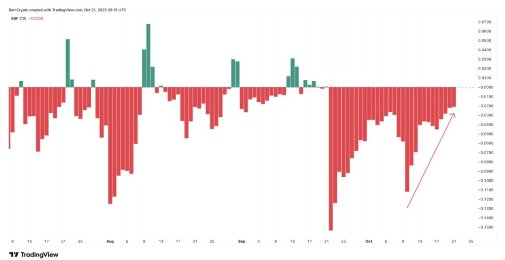 Di tengah tekanan pasar yang didominasi sentimen bearish, ada satu indikator yang masih menjaga struktur bullish jangka pendek Pi Coin, yaitu Bull Bear Power (BBP) — indikator yang mengukur selisih antara kekuatan beli dan jual.