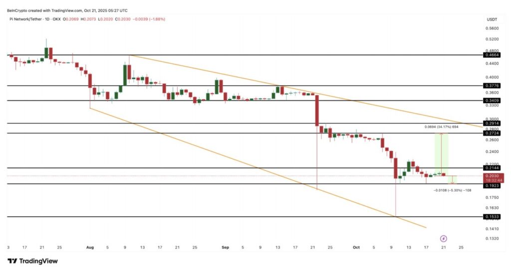 Jakarta, Pintu News – Per 21 Oktober, harga Pi Network tercatat turun 2% dalam 24 jam dan 4,5% dalam sepekan, memperpanjang koreksi bulanan yang kini mencapai 43%. Saat ini, token tersebut terjebak dalam kisaran sempit di sekitar $0,20, dengan baik pembeli maupun penjual belum mampu mengambil kendali penuh atas arah pasar.
