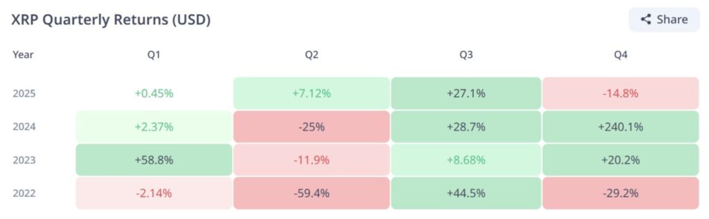 Selama bertahun-tahun, kinerja XRP di kuartal IV (Q4) menunjukkan variasi, meskipun secara rata-rata cenderung positif. Pada Q4 2022, altcoin ini mengalami kerugian tajam akibat runtuhnya bursa FTX, yang mengguncang seluruh pasar crypto.