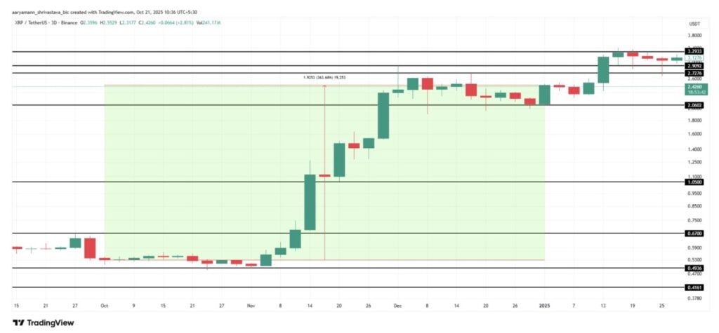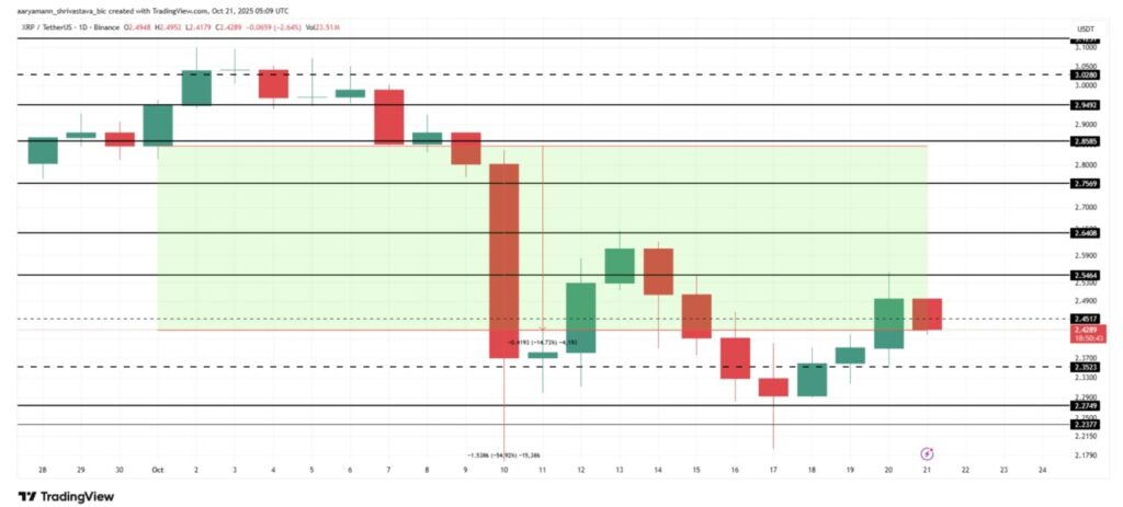 Per 21 Oktober, XRP diperdagangkan di angka $2,42, mencatat penurunan sebesar 14% sepanjang bulan ini akibat kejatuhan pasar baru-baru ini. Meski begitu, altcoin ini mulai menunjukkan tanda-tanda pemulihan, mencoba merebut kembali momentum yang hilang seiring membaiknya sentimen investor.