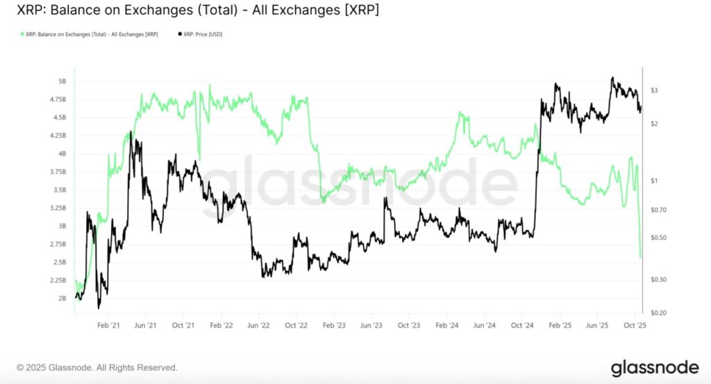 Memasuki Q4 2025, XRP tampaknya kembali membangun fondasi bullish yang kuat. Data on-chain menunjukkan bahwa akumulasi token terjadi pada laju tercepat dalam lima tahun terakhir. Sejak awal Oktober, lebih dari 960 juta XRP ā senilai sekitar $2,3 miliar ā telah dipindahkan dari bursa kripto.